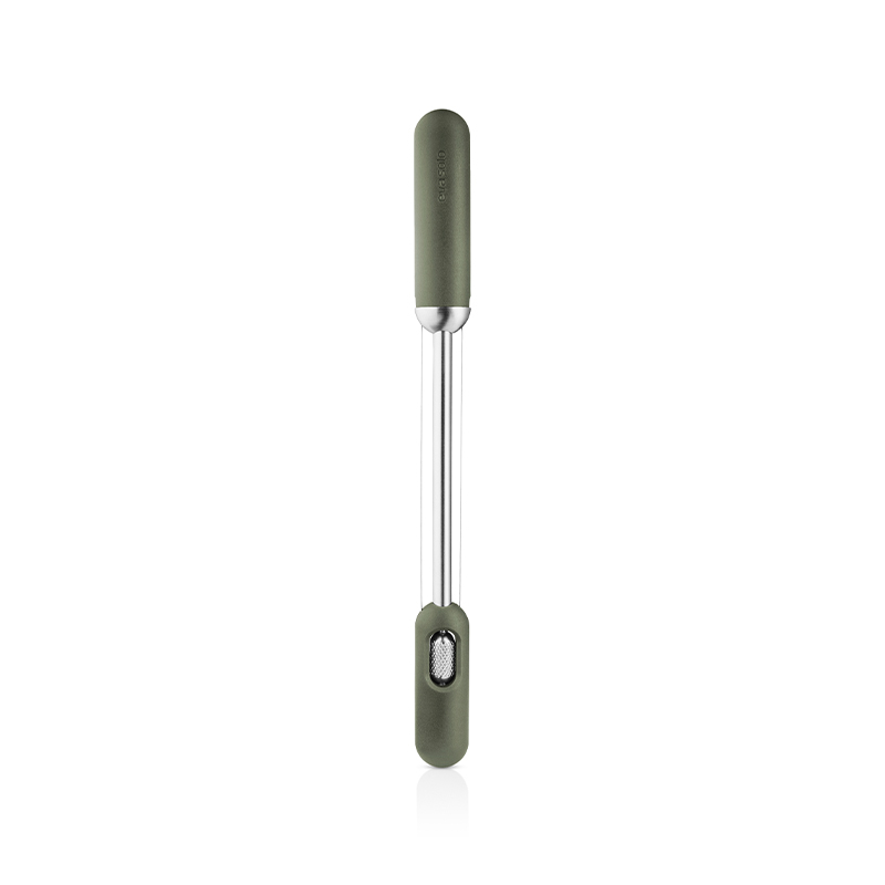 Eva Solo har designet en anderledes og yderst praktisk og funktionel osteskærer med håndtag i begge ender. Håndtaget gør det nemmere at skære ensartede skiver og på samme tid undgår du lettere at udhule osten. Osteskærerens klinge i rustfrit stål kan snildt skære faste og halvfaste oste i to forskellige skivetykkelser. Hvis der ryger en streng på osteskæreren, så kan disse tilkøbes og påsættes nemt. Osteskæreren tåler opvaskemaskine.