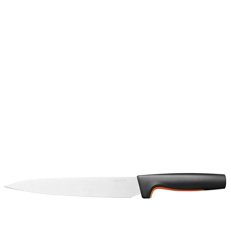 Denne forskærer kniv fra Fiskars Functional Form serien er uundværlig i køkkenet. En perfekt kokkekniv i et smart design og enormt rengøringsvenlig. Kniven har et langt, lige blad i slidstærkt, japansk rustfrit stål – kniven er blandt andet perfekt til udskæring af kød. Dens ergonomiske håndtag har Soft Grip ved fingerspidserne, så kniven ligger behageligt og sikkert i din hånd. Denne kniv tåler opvaskemaskine, for den nemme rengøring i hverdagen, og så er den nem at opbevare i køkkenskuffen med det slanke design. Kniven er designet i Finland.