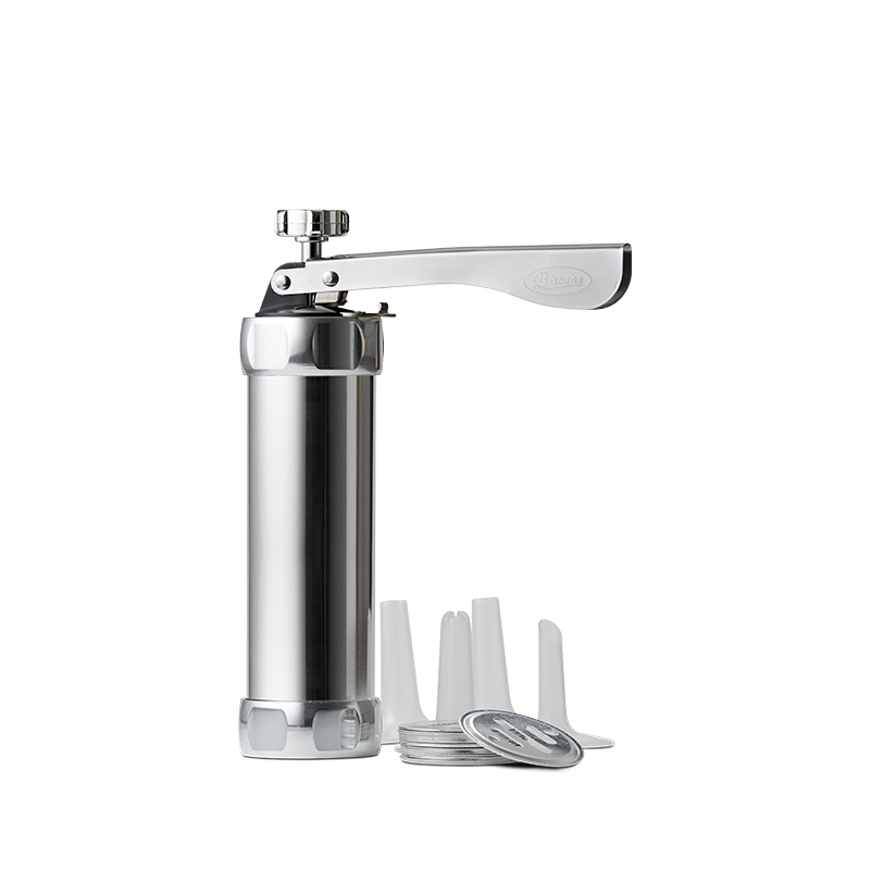 Funktion kagesprøjte i stål med 4 tyller samt 20 kageplader til fremstilling af mange forskellige kager.