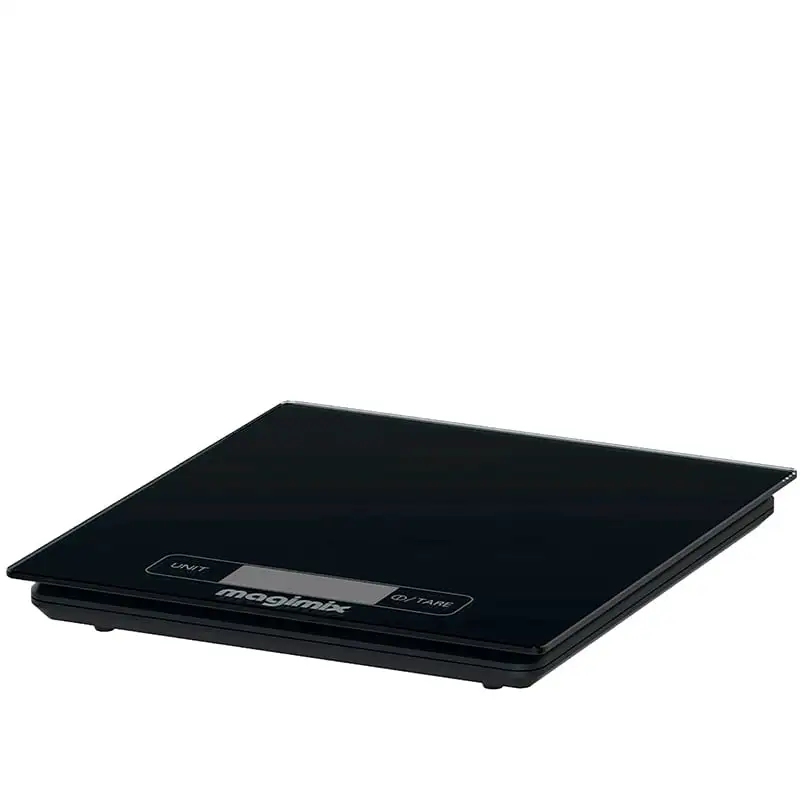 En smart stilren køkkenvægt med en sort glasplade samt en base af plast, LCD-display og touch-knapper. Denne køkkenvægt fra Magimix kan måle fra 2 gram helt op til 10 kg med kun 1 grams interval. Ligegyldig hvilket sprog din opskrift er på, så kan du måle i g/ml/kg/lb/oz. Køkkenvægten har også automatisk nulstilling efter to minutter, og burger 2x AAA batterier som medfølger. Magimix yder 3 års garanti på produktet.
