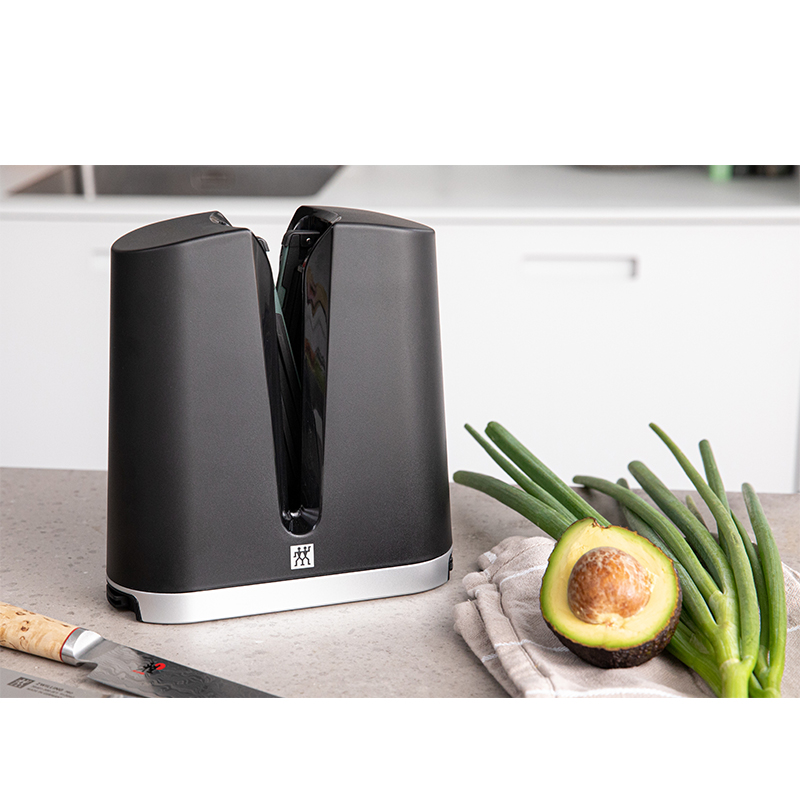 Sløve knive? Med Zwillings V-edge knivsliber kommer du aldrig til at have sløve knive. Giv din yndlingskniv nyt liv med en tur gennem V-edge knivsliberen. Madlavning kan tage så lang tid, hvis man bruger sløve knive til at hakke og skære med. Med vedligeholdte knive er madlavningen let som en leg. Når du investerer i denne knivsliber, får du adaptere med, så du snildt kan slibe både europæiske og japanske knive.